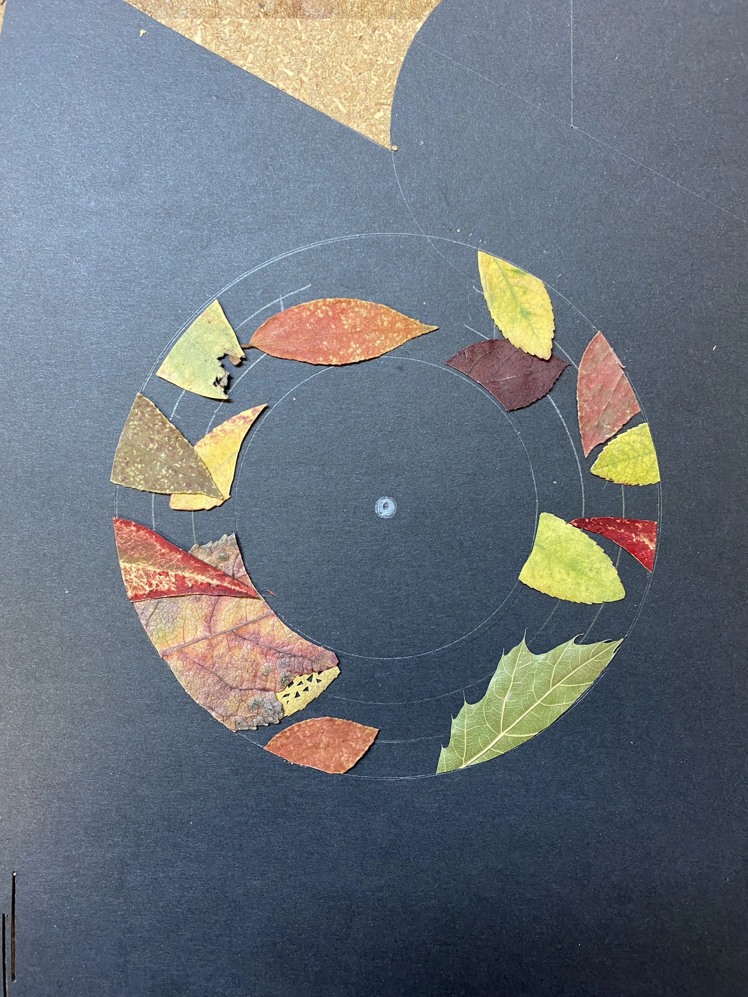 I arranged the leaves under a rosette shaped cut-out. I tried many arrangements, saving the ones I liked, until I found one that I decided to go with.