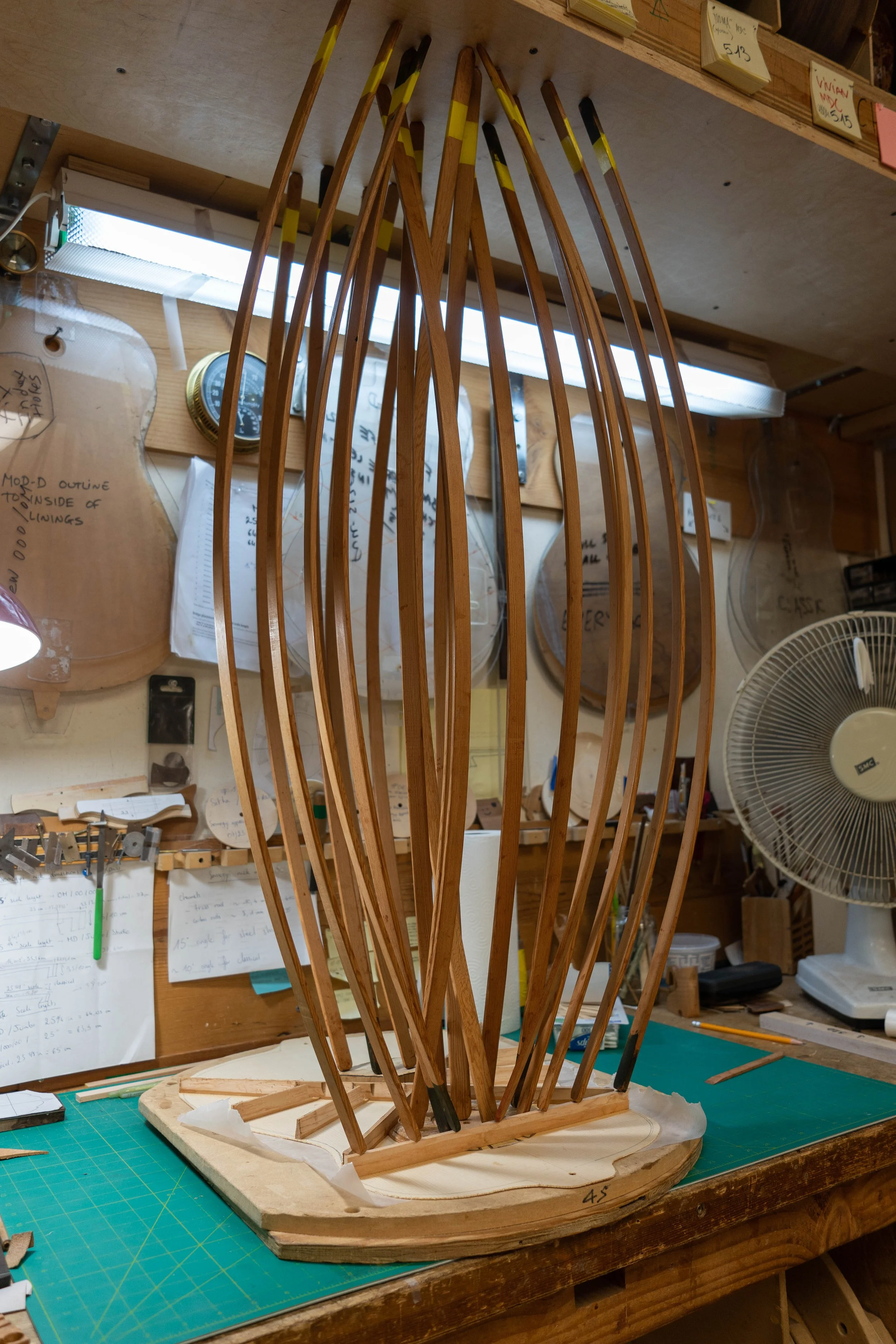 Three layers of mahogany fresh out of the bending jig. They need some touching up by hand on the bending iron to be ready to be laminated for my solid linings. Note the sides which are sitting in the laminating form. The solid lining will be glued up inside of the sides, to ensure they conform accurately to the shape they need to be.